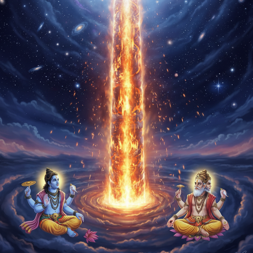 He asked them to find ends of the pillar, the one who finds this answer will be declared the superior. Lord Vishnu took the form of a वराह (Varaha) , which means boar and he dug deep into the earth to find the base of the pillar. Lord Brahma took the form of a हंस (Hamsa), which means swan and flew high skies to find the top. After searching for long, neither could find the end of the pillar. Lord Vishnu returned and humbly confessed that the pillar had no end, it was infinite.